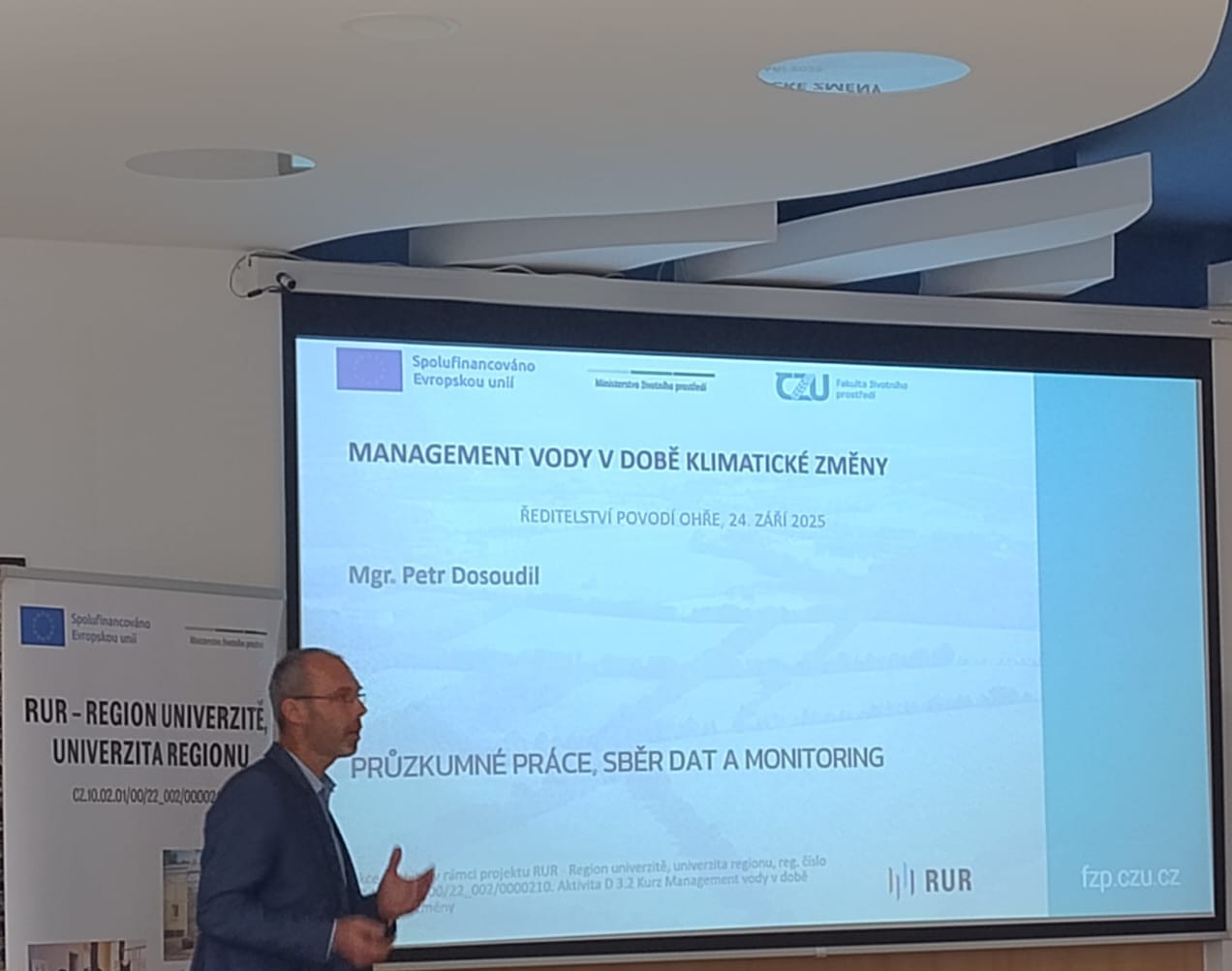 - září 2025 provedl náš tým specializovaný kurz Management vody v době klimatické změny, připravený v rámci projektu RUR – Region univerzitě, univerzita regionu. Akce se konala v prostorách generálního ředitelství státního podniku Povodí Ohře v Chomutově za účasti vedení podniku. Celkem se kurzu zúčastnilo 28 osob.